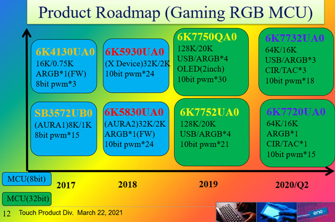 其新一代AURA3及AURA4的產品採用M0的MCU為基準,其料號6K7750QA0/6K7752UA0/6K7732UA0/6K7720UA0,增加了USB的傳輸介面及ARGB LED的相關應用,可以更廣泛的應用於風扇及電腦機殼…等市場。